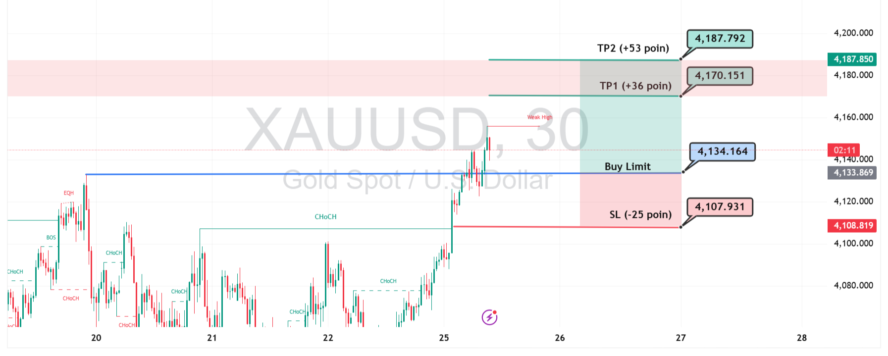 XAUUSD kembali bergerak naik setelah menembus struktur penting dan membentuk Weak High, menandakan tekanan beli masih dominan. Area buy limit di 4.134 menjadi titik masuk ideal karena berada di zona permintaan yang baru dikonfirmasi.