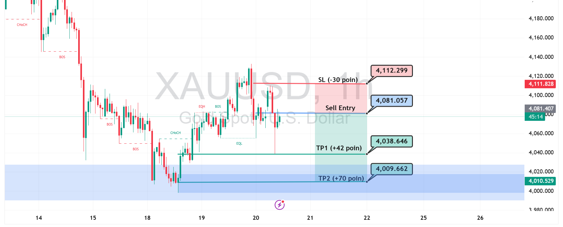 Area Sell Entry di sekitar 4.081 menjadi titik kunci, karena level ini berada tepat di bawah rejeksi kuat sebelumnya. Jika tekanan bearish berlanjut, target pertama menuju 4.038 berpeluang tercapai, sejalan dengan retest minor support yang sebelumnya terbentuk dari akumulasi pembeli. Reaksi harga di zona ini akan menentukan apakah penurunan berlanjut atau terjadi pullback singkat.