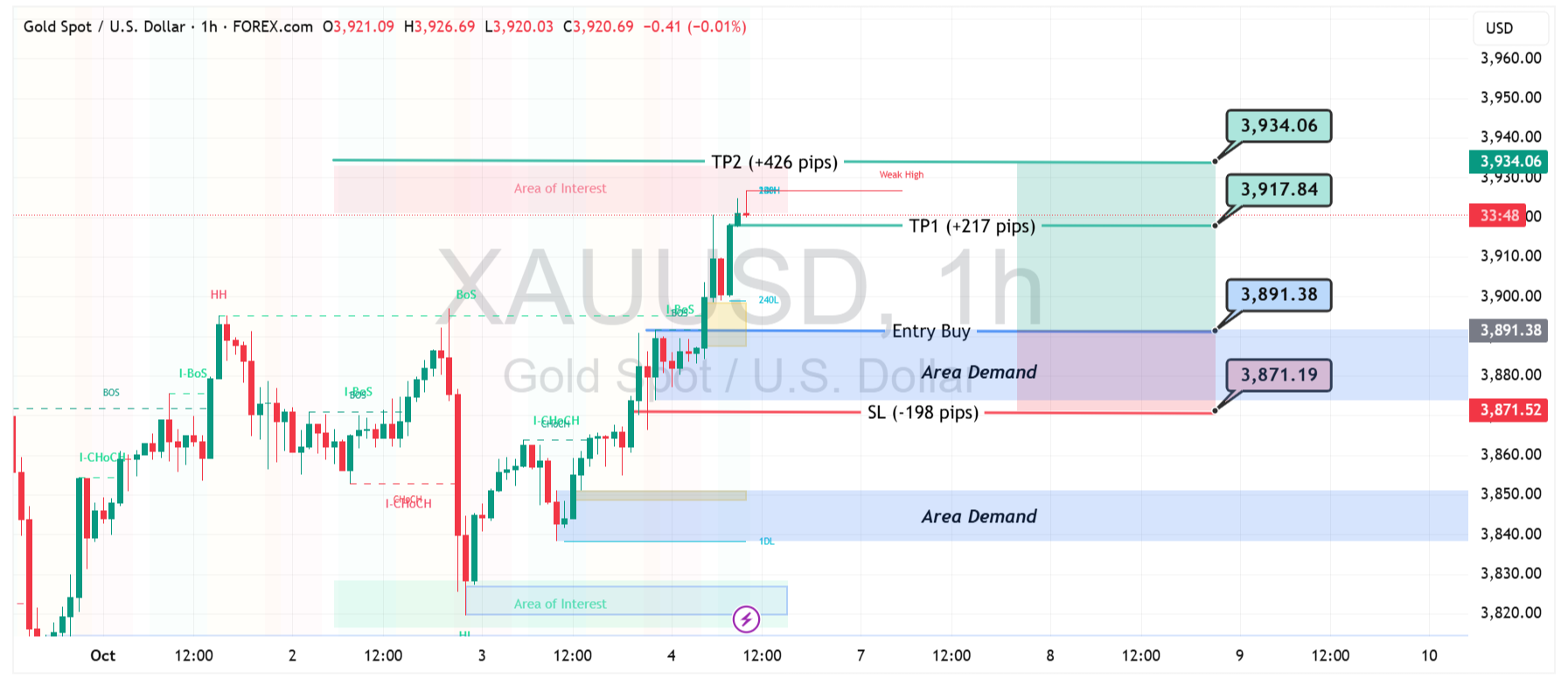 Skenario teknikal menunjukkan potensi kenaikan menuju target pertama di $3.917 dan target lanjutan di $3.934 apabila momentum beli tetap terjaga. Struktur pasar juga mendukung bias positif dengan adanya Break of Structure (BoS) yang mengonfirmasi pembentukan higher high baru. Selama harga tidak menembus support utama, peluang lanjutan penguatan masih terbuka lebar.